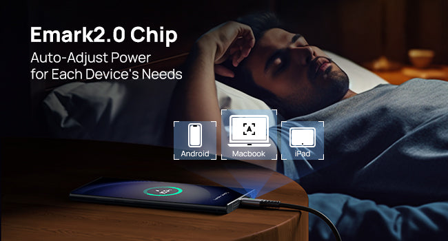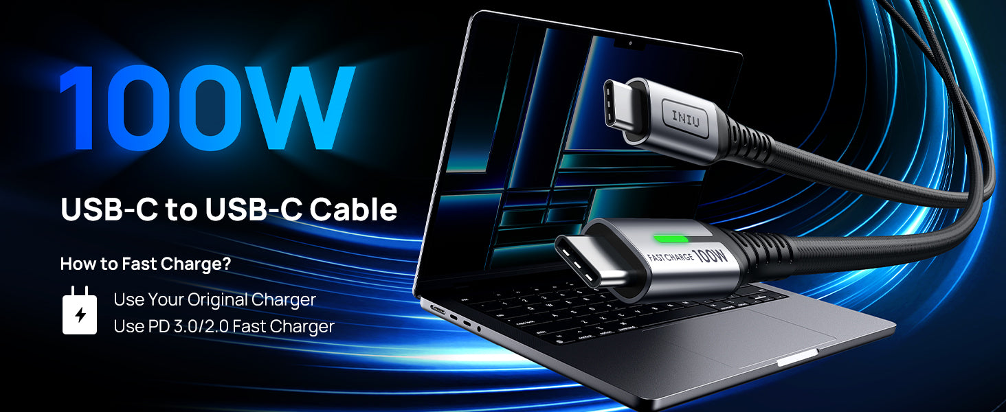 Kabel USB-C do USB-C o mocy 100 W do szybkiego ładowania został wyposażony w podwójny układ z certyfikatem E-Mark, który automatycznie wykrywa urządzenia i dostarcza wymaganą moc, zapewniając błyskawiczne i bezpieczne ładowanie.