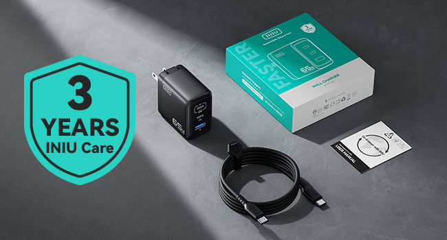 • What You Get: INIU 65W Wall Charger x1, Fast Charging USB-C Cable x1, User Manual x1, Industry-Leading 3-Year INIU Care, and Lifetime Technical Support.