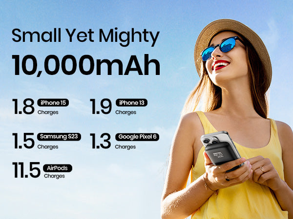 • Moc na wiele dni: Ten Capacity W miniaturowej obudowie zgromadzono 10000 mAh, co pozwala na 3,6-krotne naładowanie iPhone'a 8 i Samsunga S10 razy 2,1, iPad Mini 1,5 razy, a AirPods Pro 12,5 razy itd.