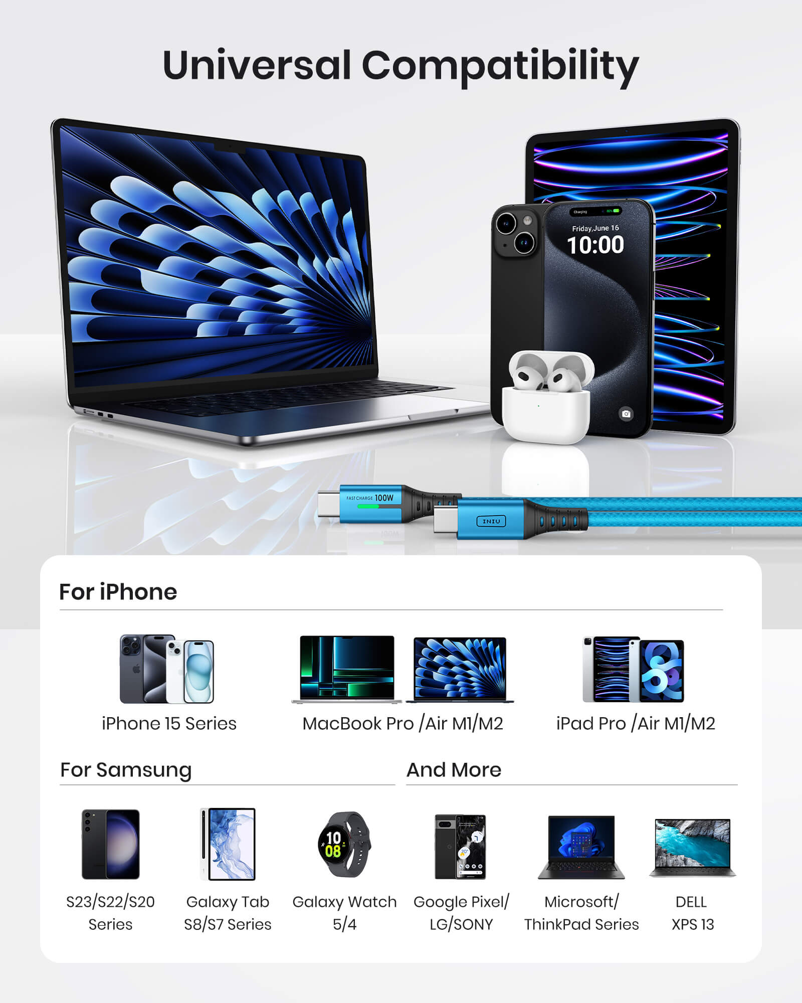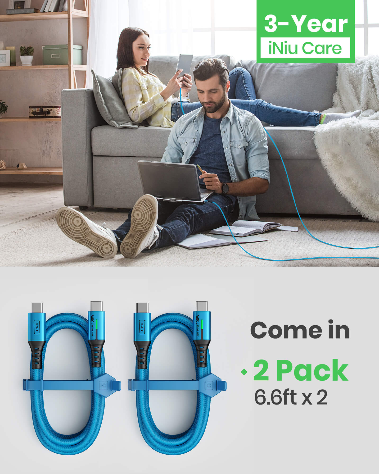 INIU Kabel USB C do C D5CC, niebieski, 100 W (2 m, 2 sztuki), kompatybilny z iPhone 14, 13, 12 Pro, Samsung S21 Tablet Google LG iPad itp.