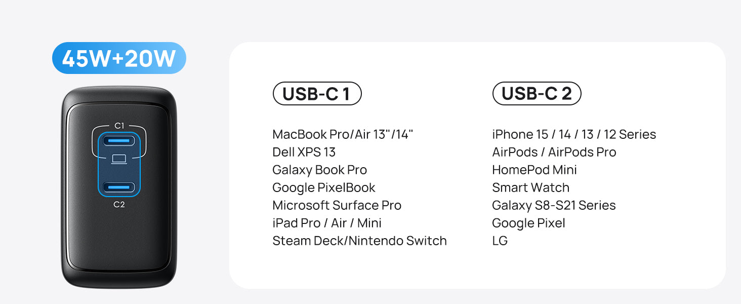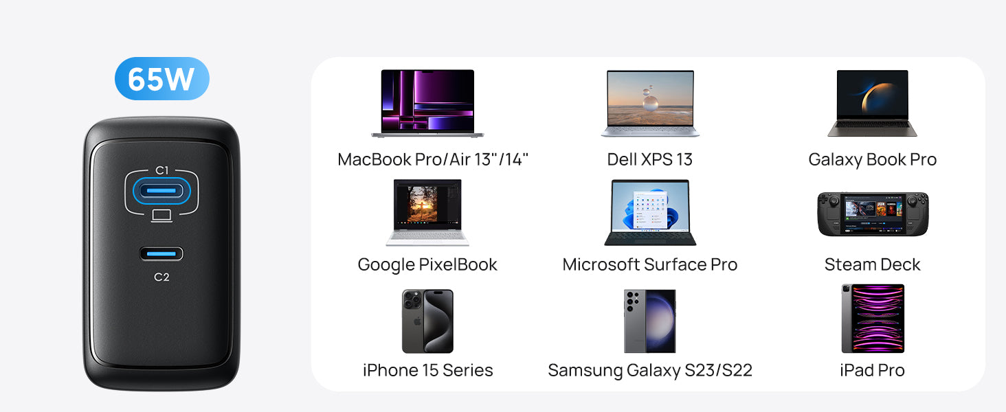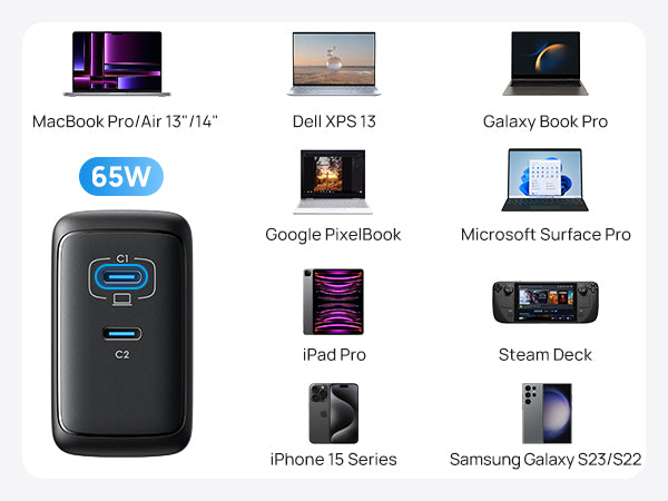 - [65 W szybko dla wszystkich urządzeń przenośnych] Dzięki mocy wyjściowej 65 W ta ładowarka może szybko ładować wszystkie Twoje urządzenia przenośne z pełną prędkością – smartfony, tablety, a nawet energochłonne gadżety, takie jak SteamDeck. Ciesz się błyskawicznym ładowaniem.