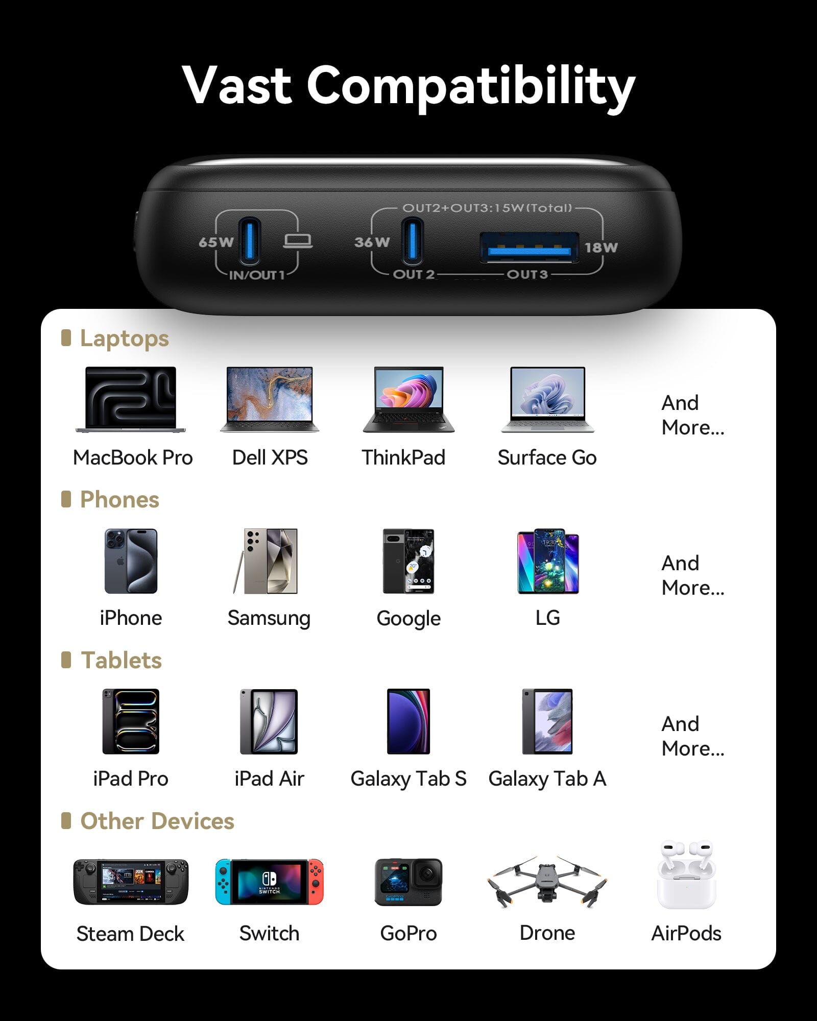 Dzięki bardziej kompaktowej konstrukcji obwodów długość power banku można zmniejszyć o 15 mm bez utraty mocy i wydajności.