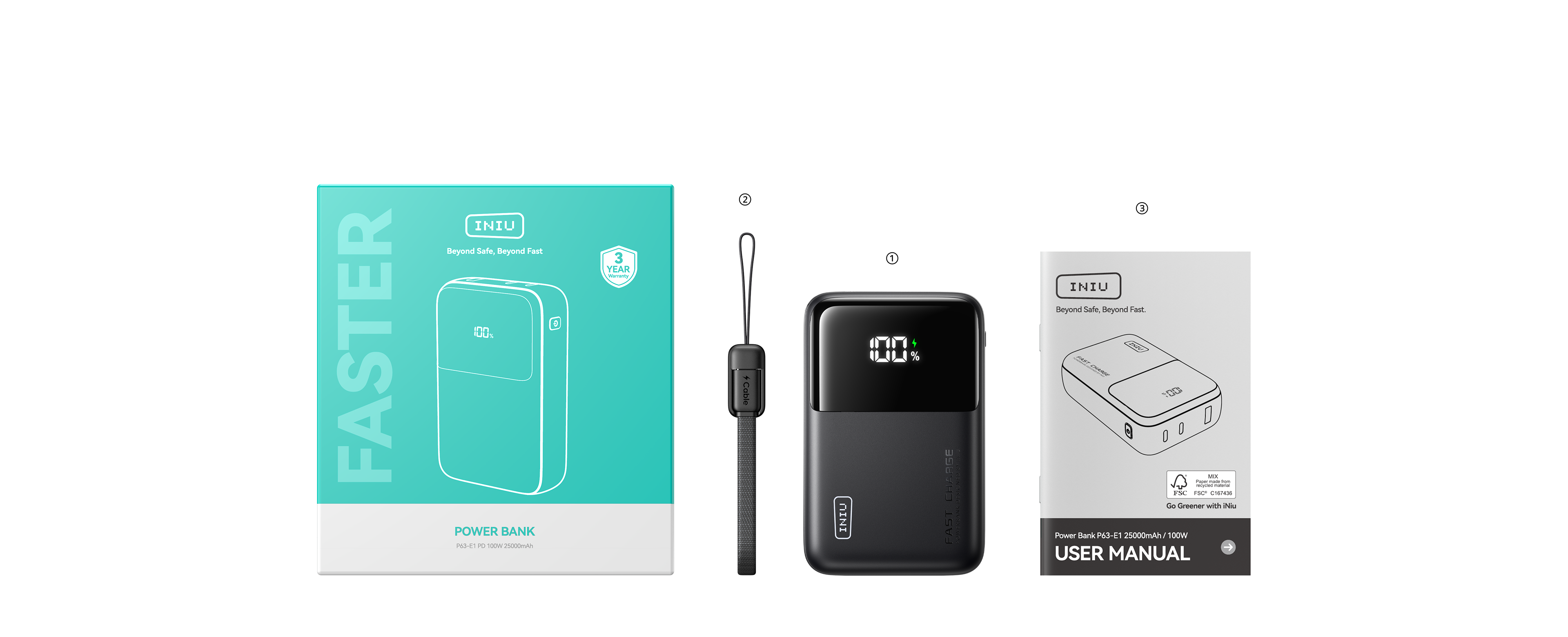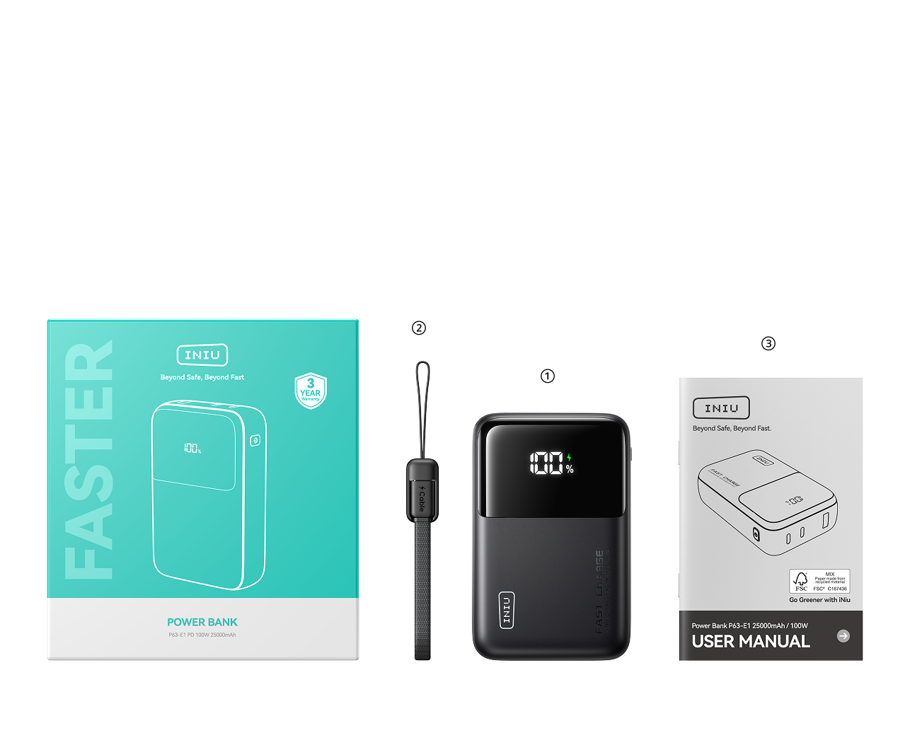 • W pudełku: Power Bank P63-E1*1, kabel USB-C do USB-C o długości 0,3 m/1 stopy*1, instrukcja obsługi*1