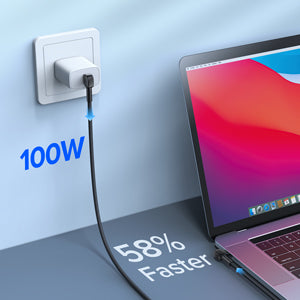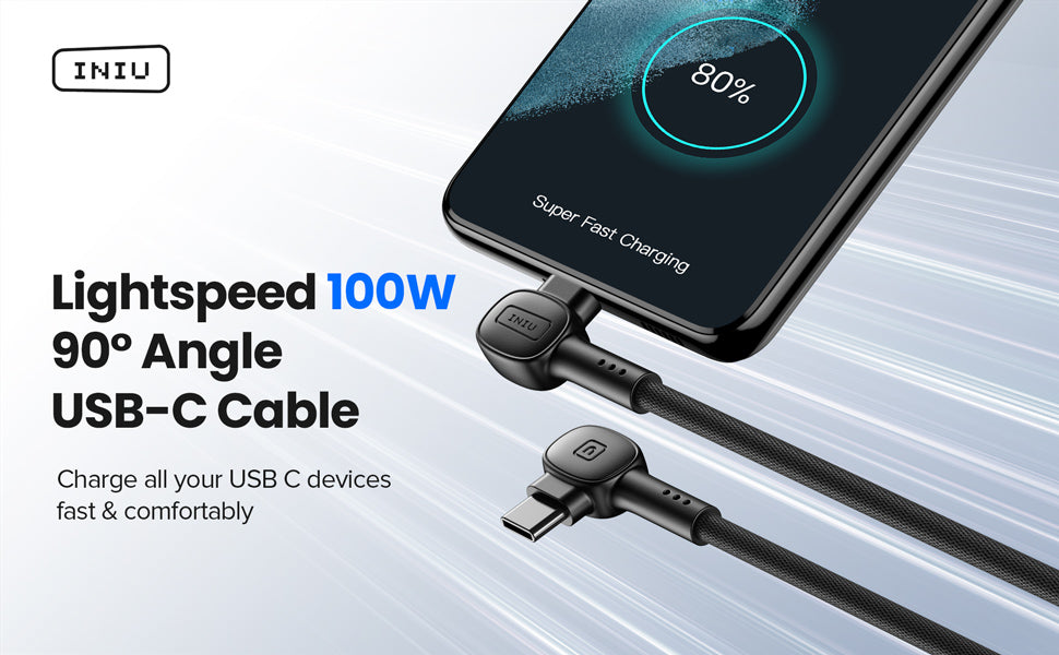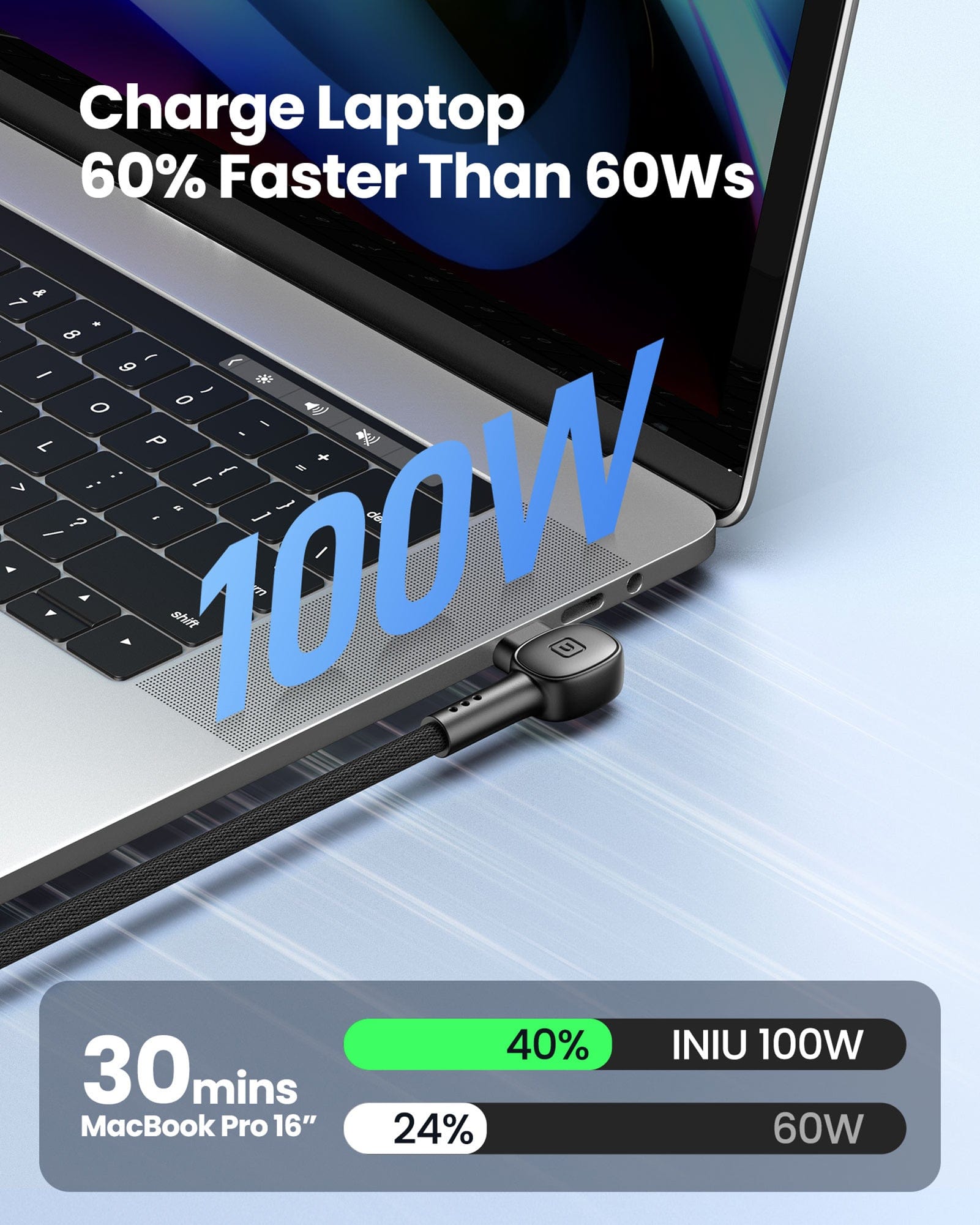 Why This INIU 100W USB-C to USB-C Cable?✔ Incredibly 100W Max cable powers Samsung S21 up to 80% in just 35mins.✔ Swiftly charges MacBook Pro 16'' up to 38% in 30mins—58% faster than low-speed 60Ws.✔ 90°Angle design provides great comfort of charging while playing games or browsing websites.✔ Compatible with all USB-C devices from phones, tablets to laptops.✔ Premium materials create the most durable cable ever that lasts for 10 years.
