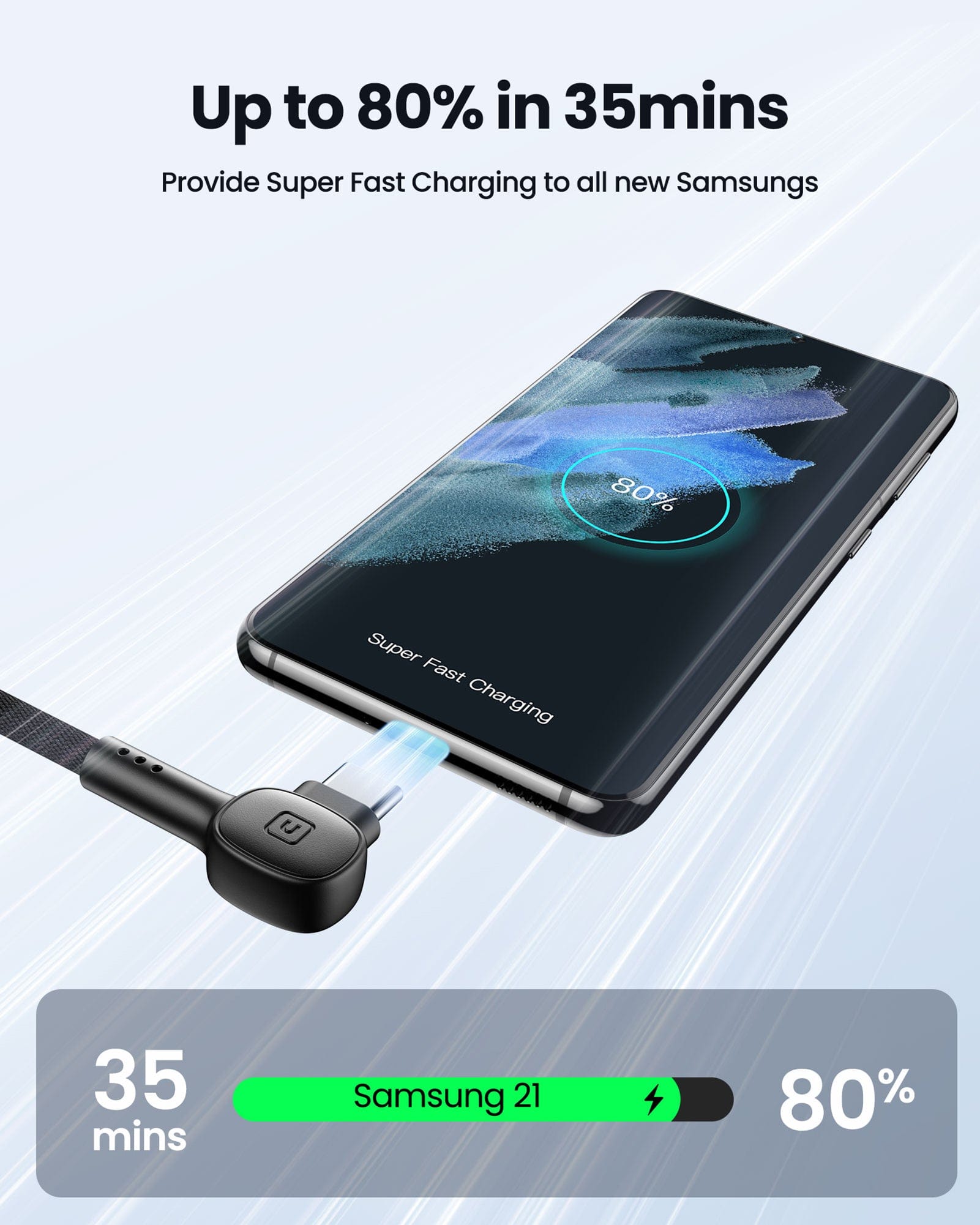 A maximum current of 5A enables the cable to fully fuel Samsung S21 in just 75 minutes—it saves you over 30 minutes compared to those 3.1A’s 2 hours.