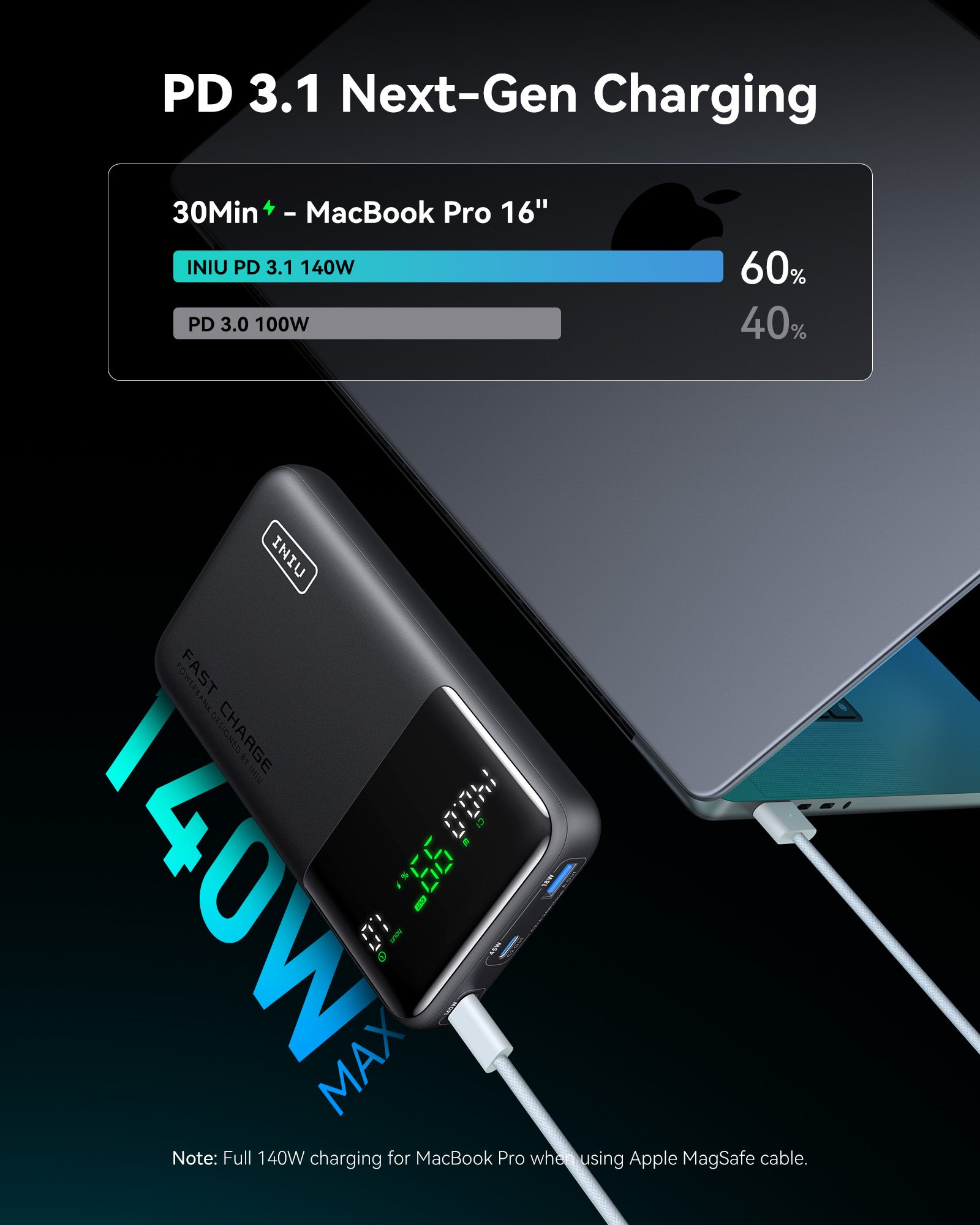 Yes, INIU P64-E1 is a 140W power bank, meaning it can provide up to 140W output power, which is enough to provide PD3.1 fast charging for laptop. That's ideal for high-performance laptops, tablets, and gaming consoles.