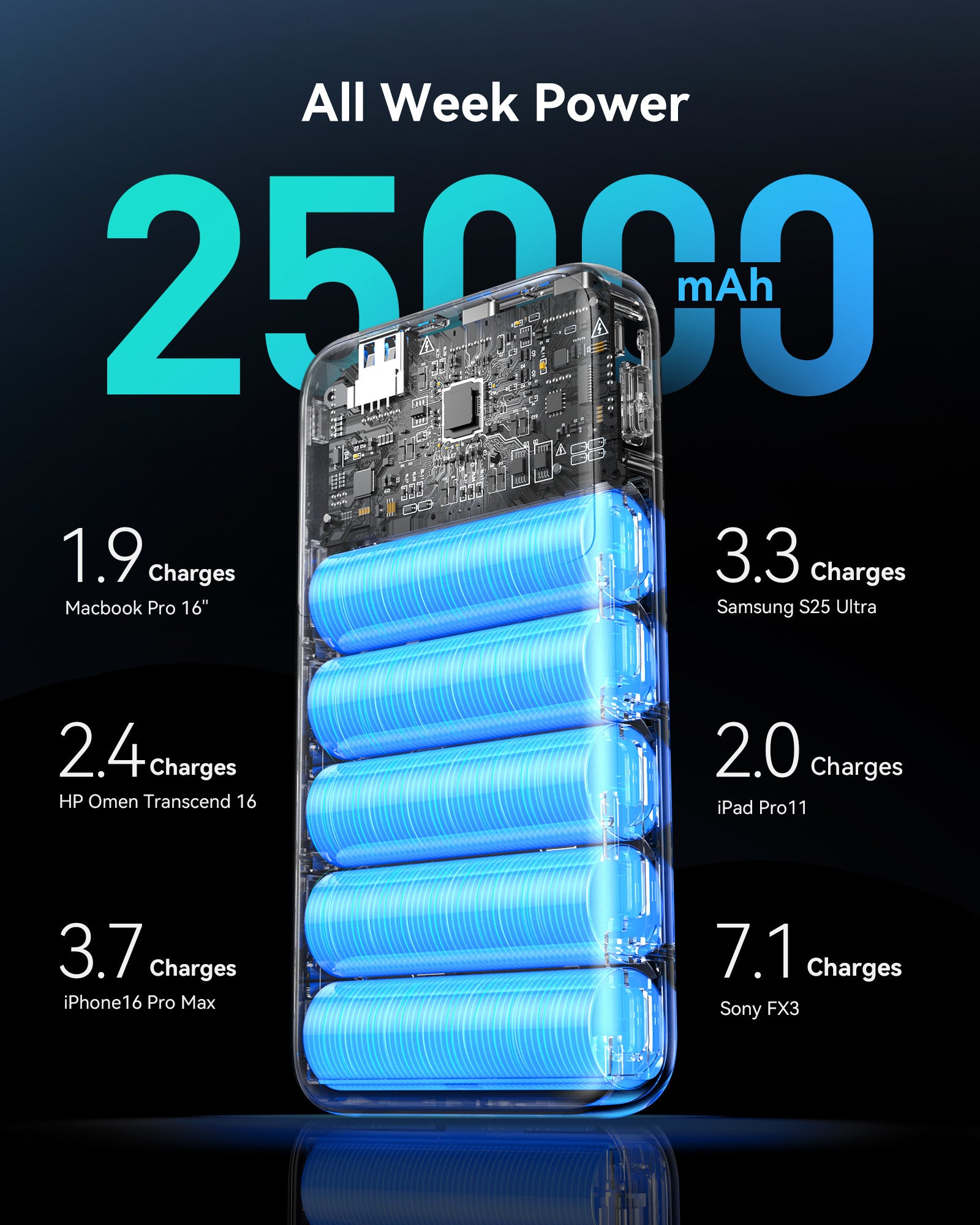 • [Massive Airline-Approved 25,000mAh]With a whopping airline-approved 25,000mAh battery capacity, this 25000 mah power bank gets multiple charges for all your devices on the go in recharge once.