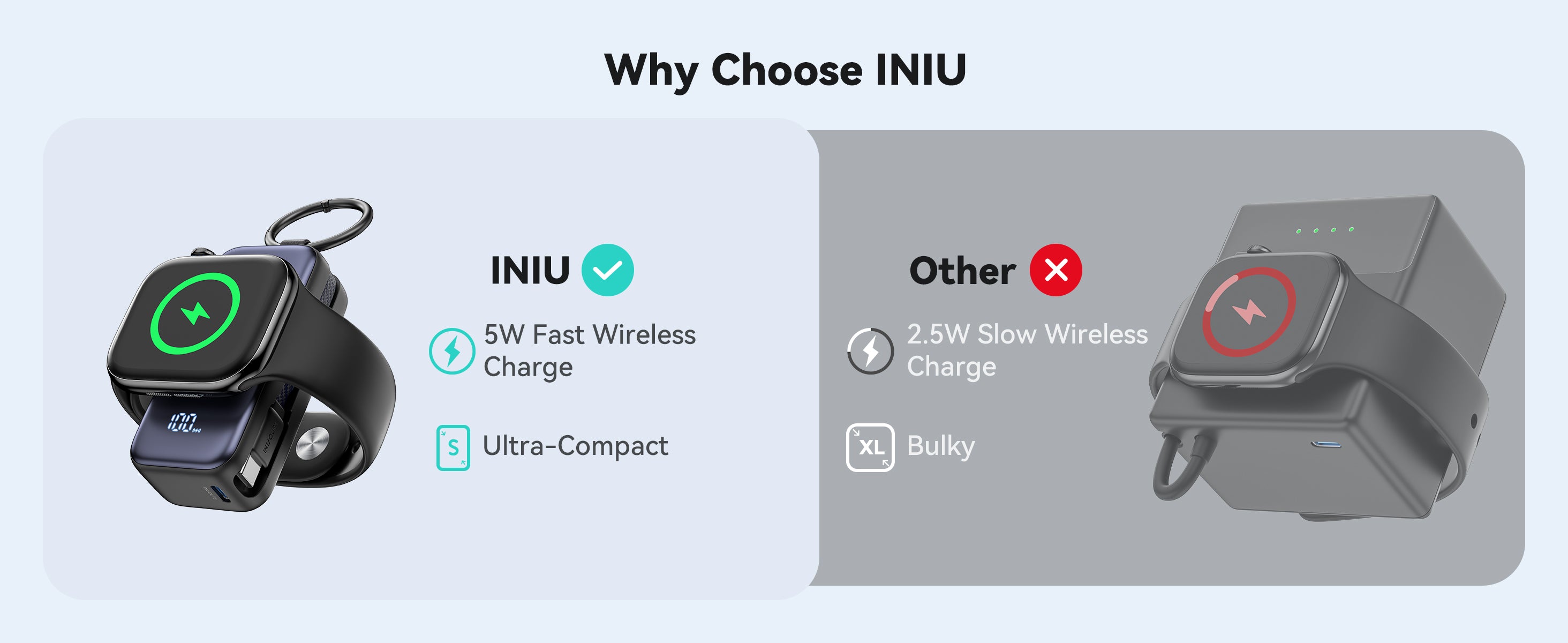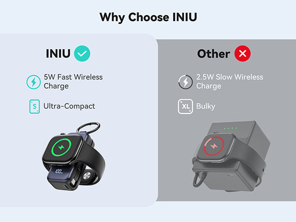 - [What You Get] INIU 5,000mAh power bank for iwatch*1, user manual*1, and INIU industry-leading 3-year care and lifetime technical support.