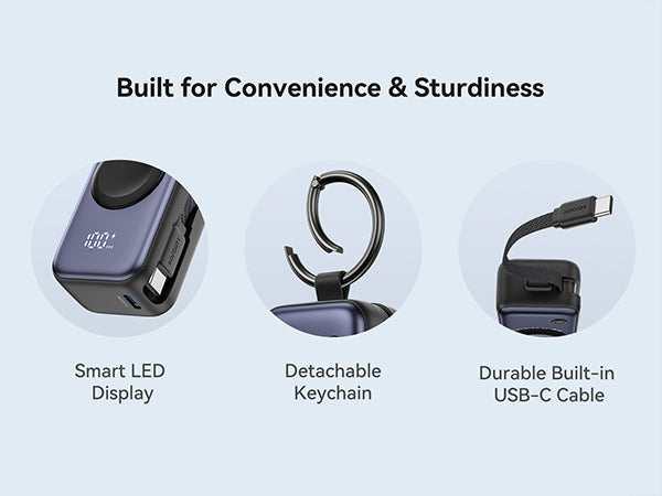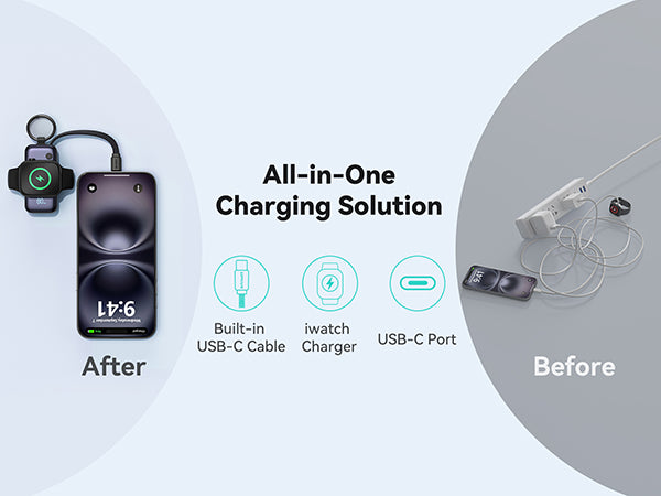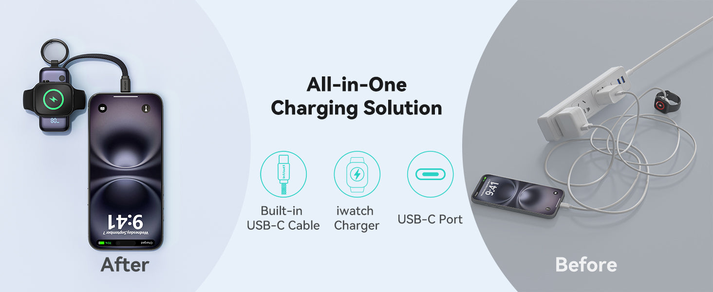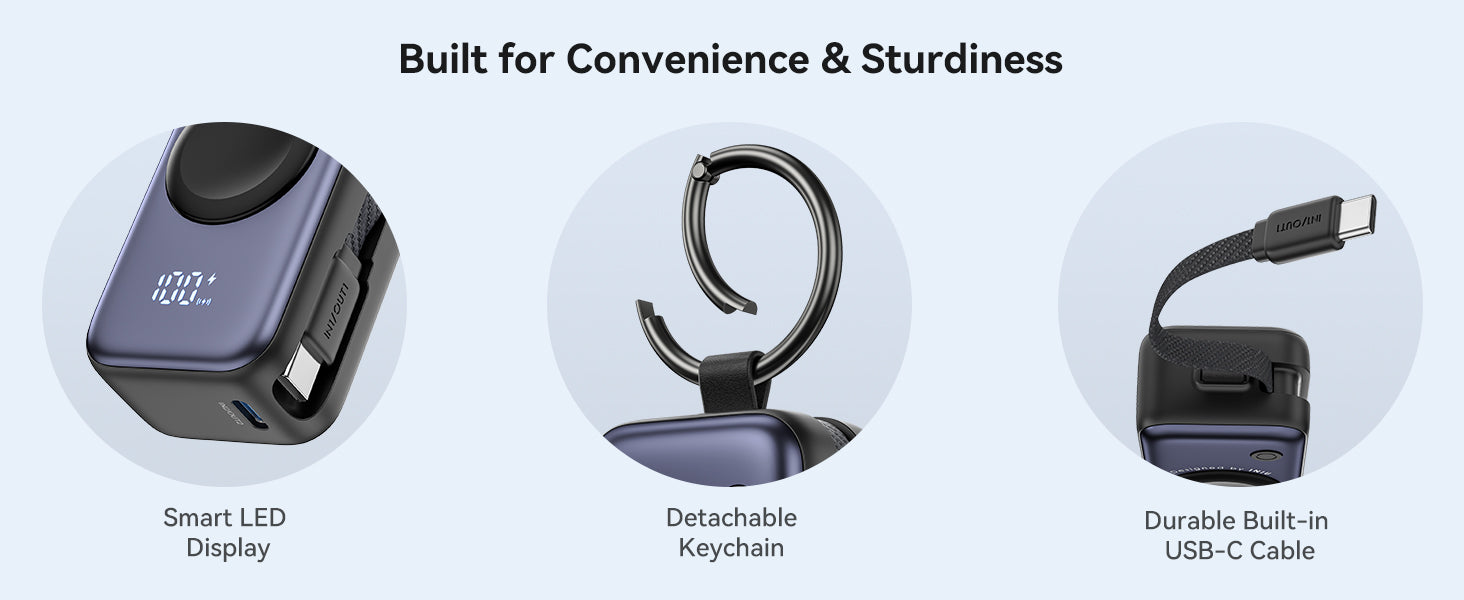 - [Multi-Device Charging] Equipped with a built-in USB-C cable and an additional USB-C port, this portable power bank powers your iPhone, iwatch, and AirPods simultaneously—without the hassle of carrying multiple chargers.